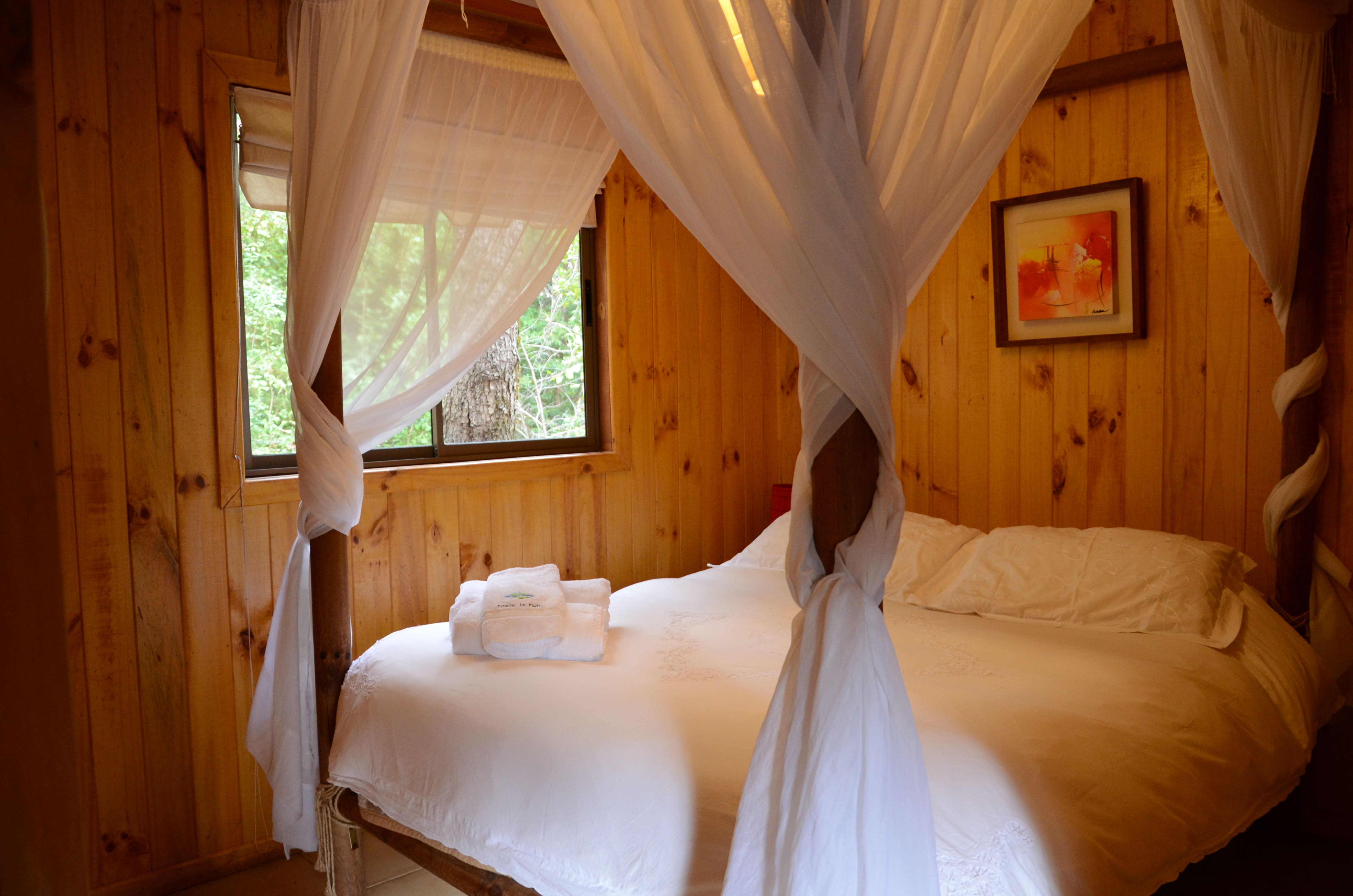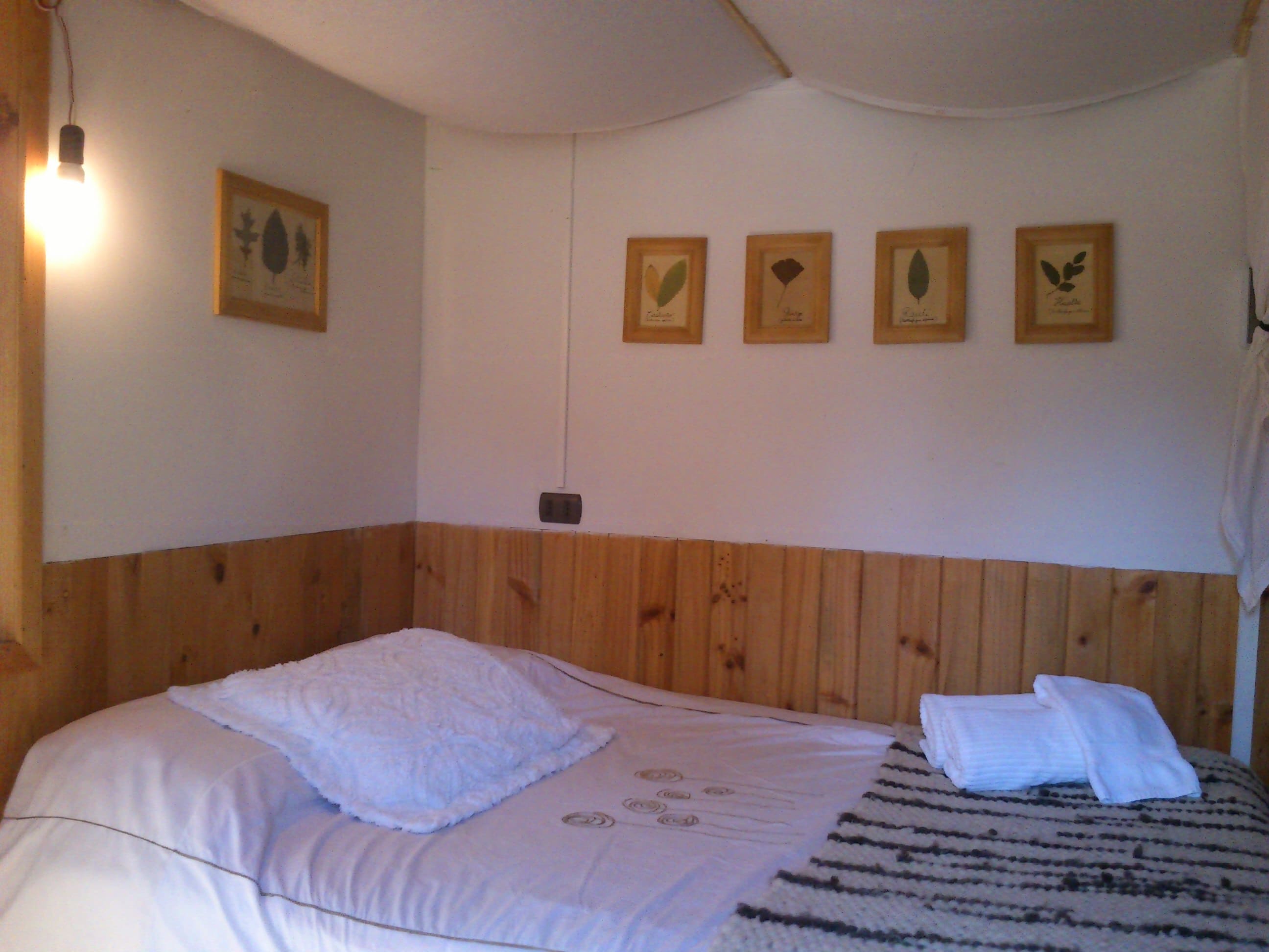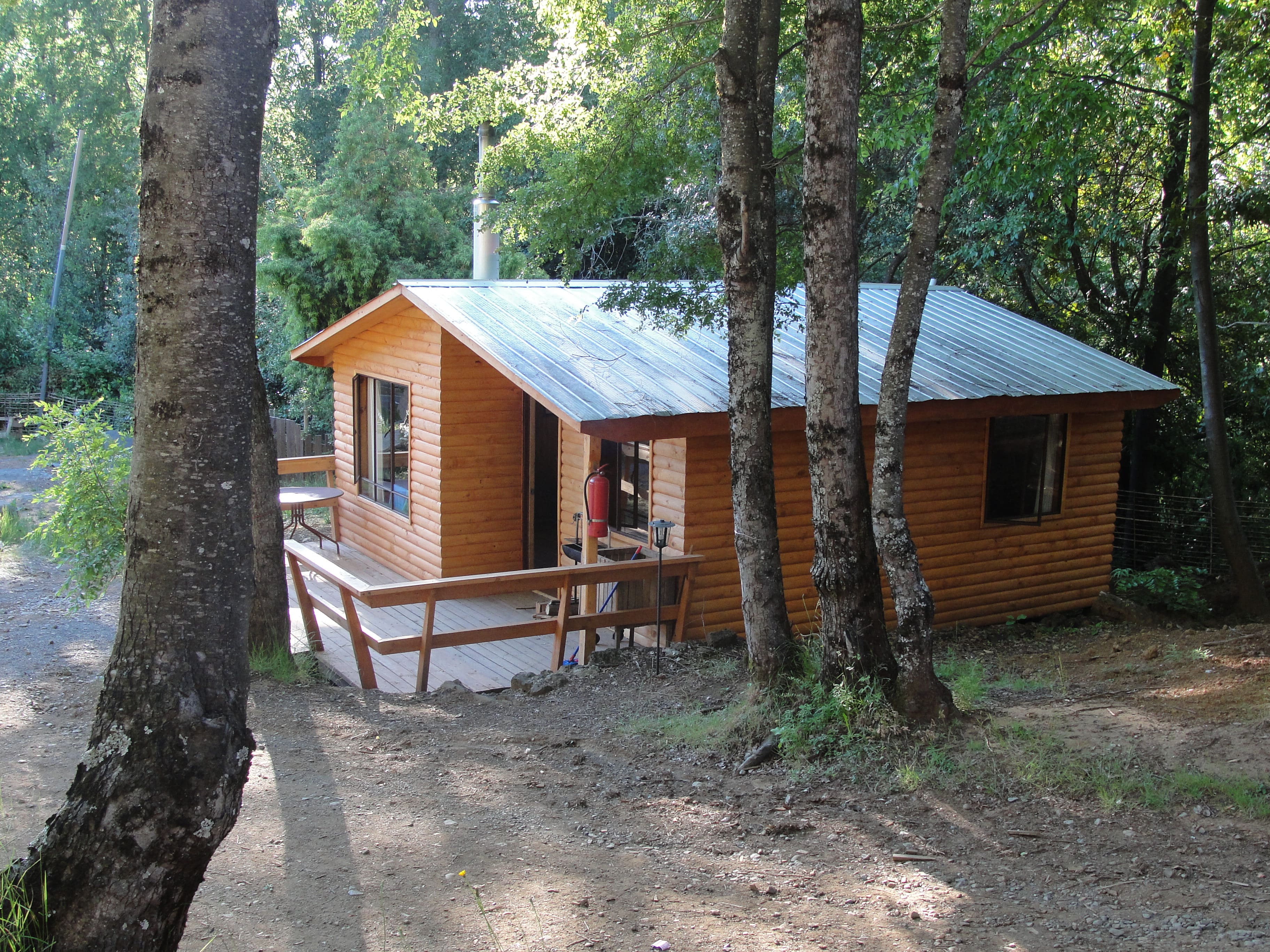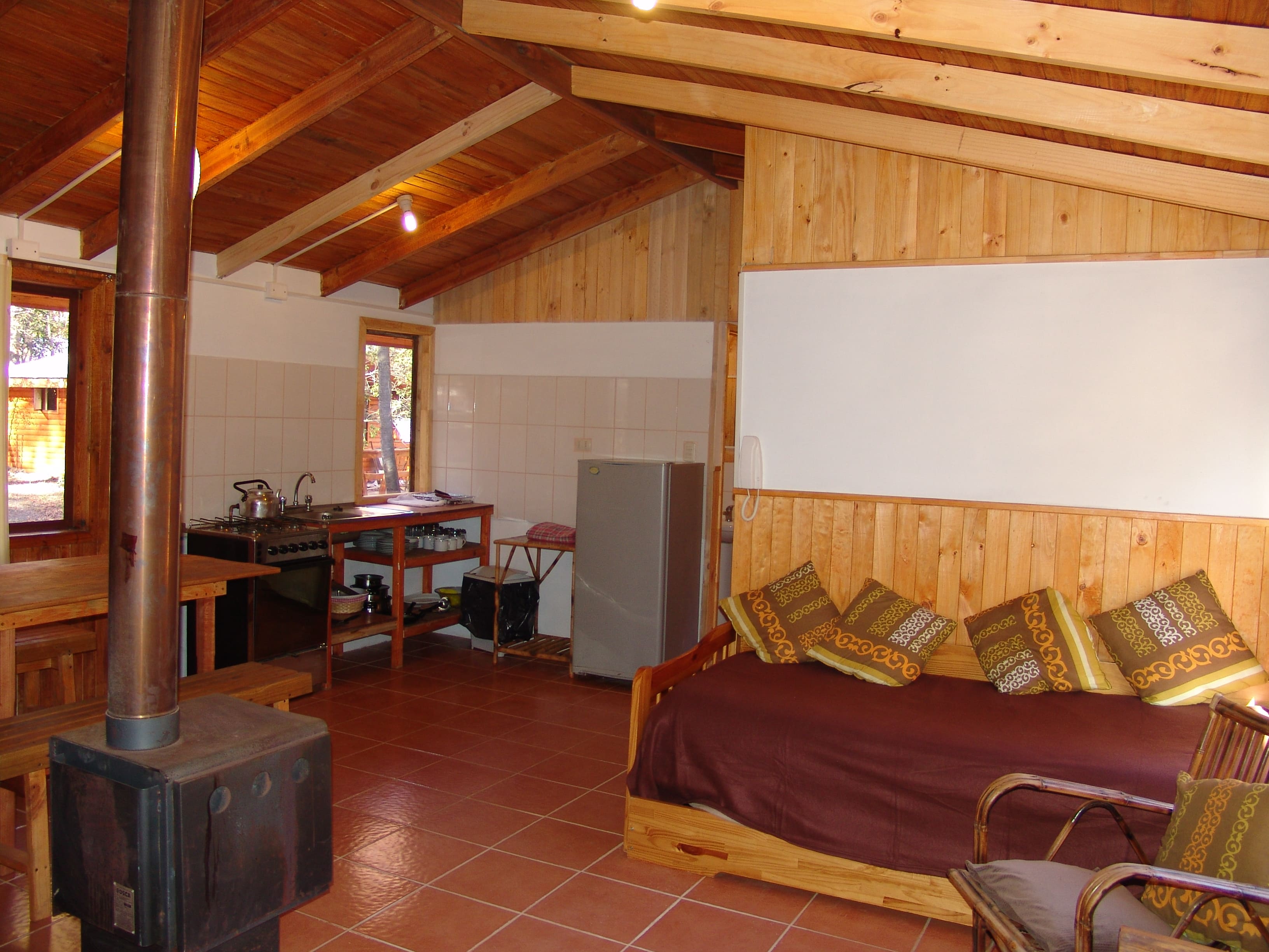 Cabaña completamente equipada para 2 personas, baño con ducha ,un solo ambiente con cama matrimonial, kitchenette,terraza techada con parrilla para asados
